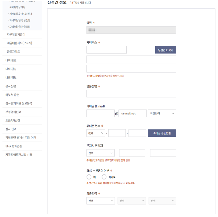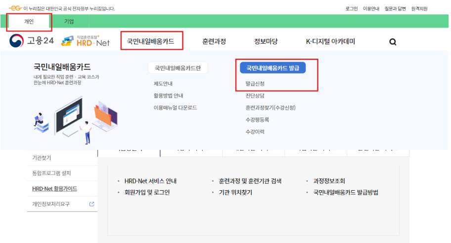 - 3단계: 국민내일배움카드 신청 메뉴 선택