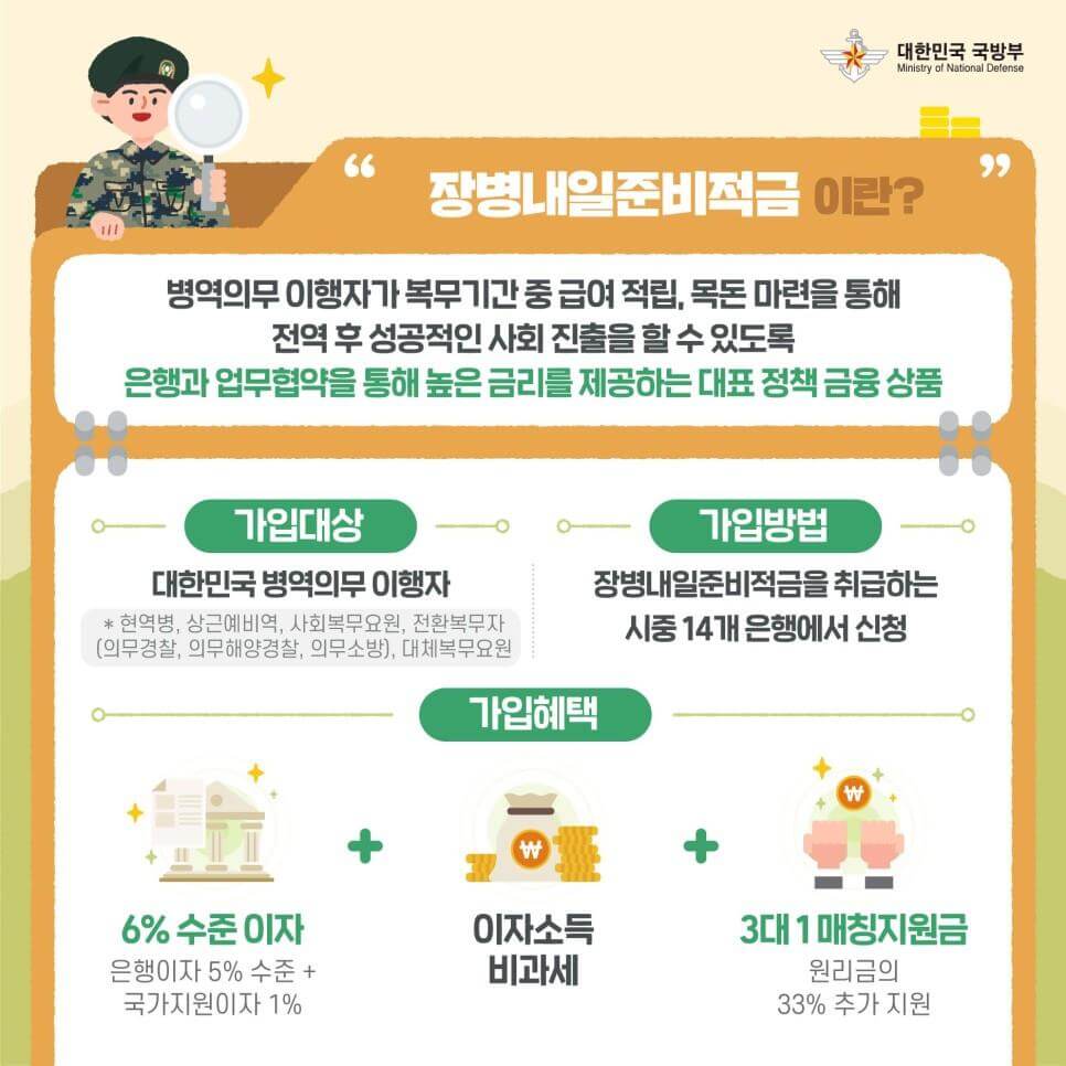 장병내일준비적금은 병역의무 이행자들이 급여를 활용해 높은 금리로 저축할 수 있도록 정부가 지원하는 금융상품입니다. 군 복무 중 저축 습관을 형성하고, 전역 후 사회 진출을 위한 목돈 마련이 가능하다는 점에서 매우 유용합니다.